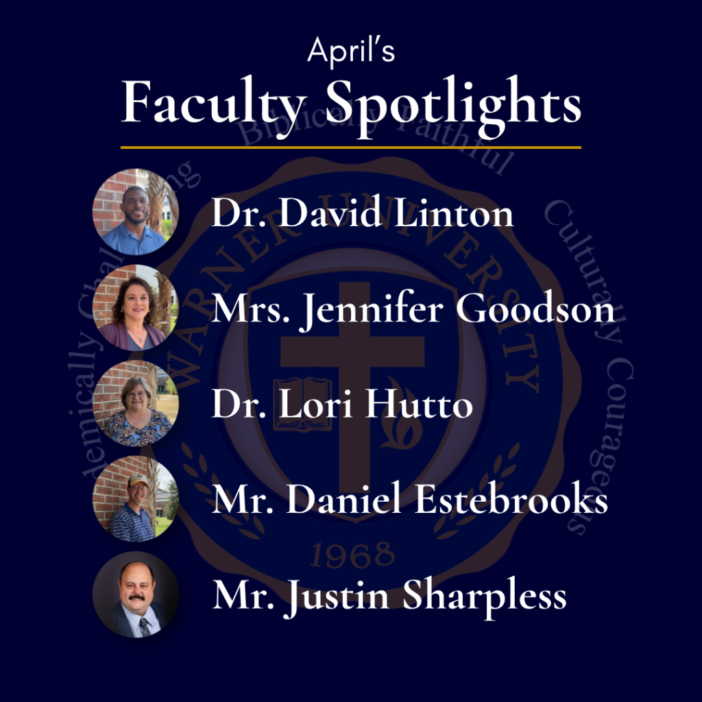Here at Warner University, we celebrate excellence. We are blessed to not only have excellent students, but we also have faculty who pursue excellence in all they do. We want to highlight a few who are doing great things inside and outside of the classroom: